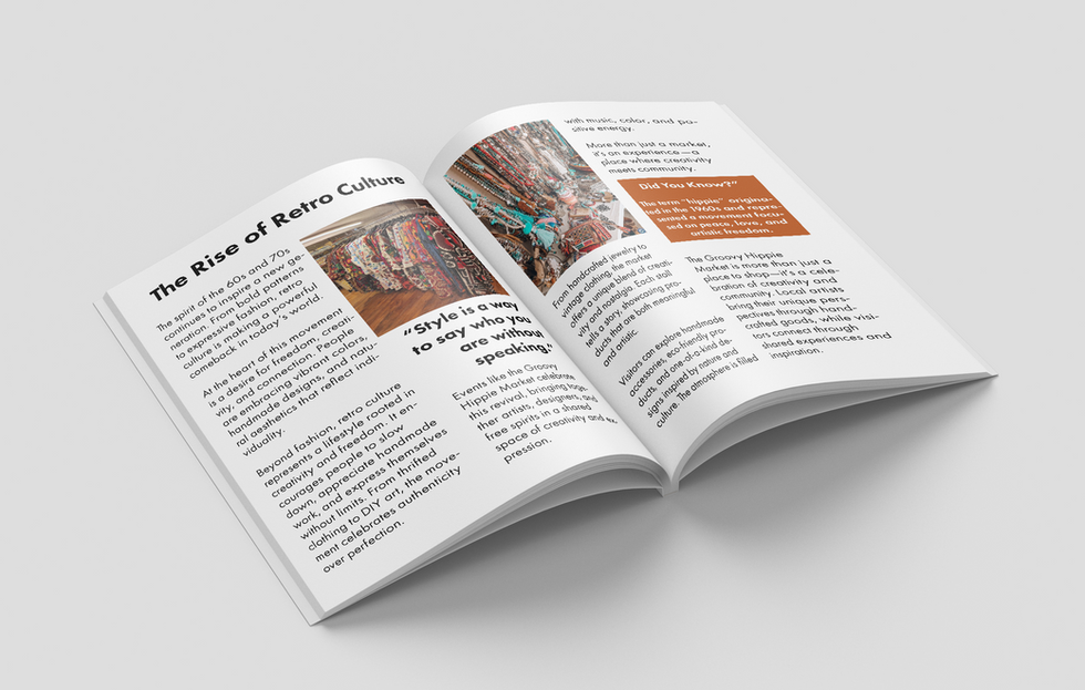 The magazine cover for Retro Groove was designed to capture the essence of 1960s and 70s hippie culture through bold typography, warm earthy tones, and expressive floral illustrations. The visual style reflects themes of creativity, freedom, and vintage aesthetics, while maintaining a clean and structured layout for readability. The combination of retro-inspired elements and modern composition creates a balanced design that is both visually engaging and relevant for contemporary audiences.
